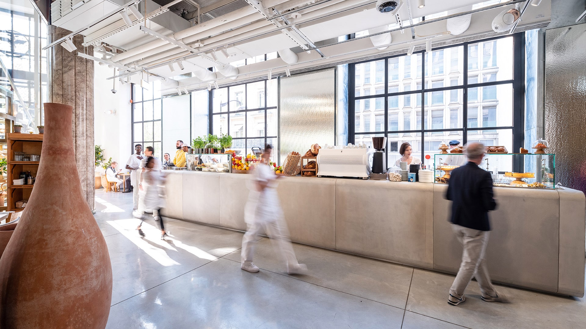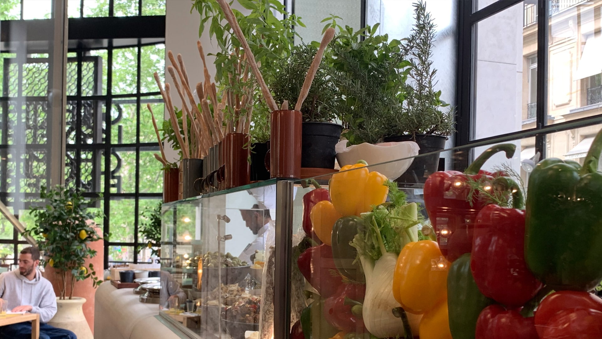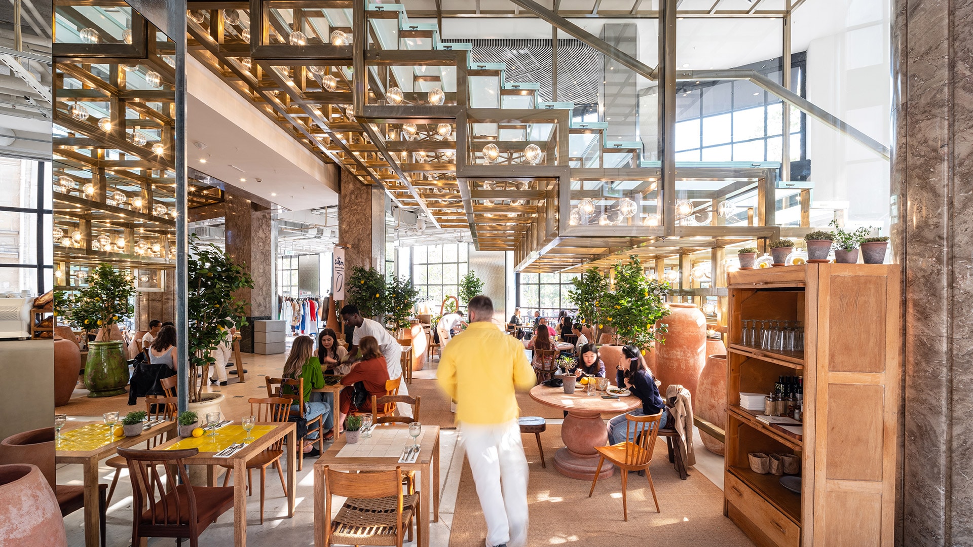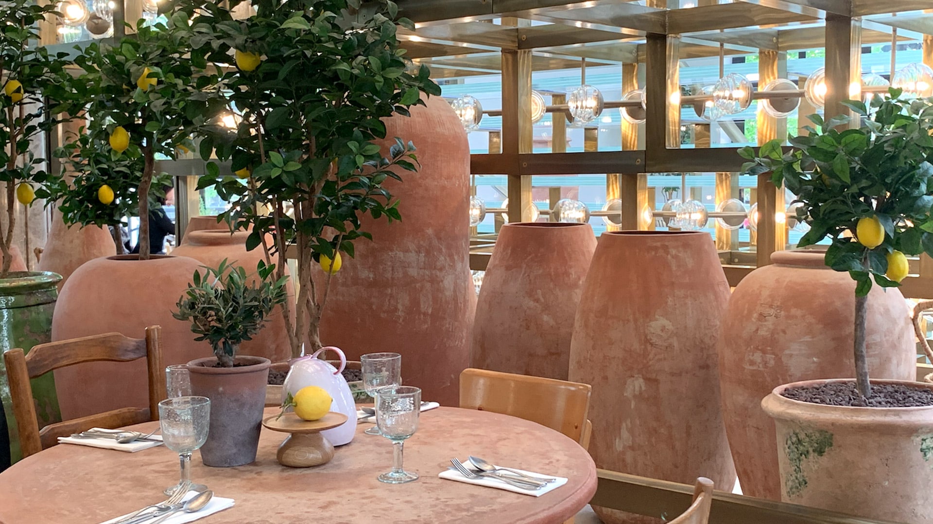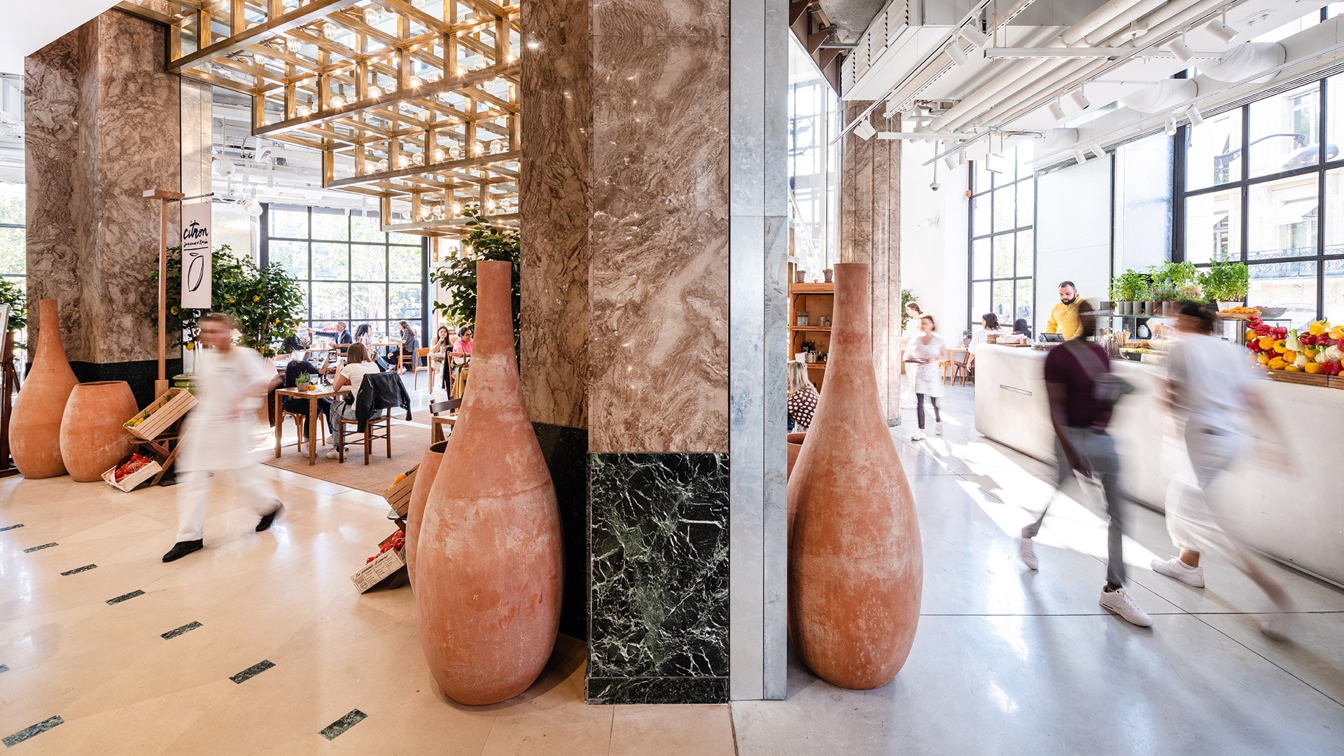 – Une douceur méditerranéenne posée sous l’escalier du concept store:citronniers, grandes jarres terre rouge, zelliges jaune citron et vert olive, chaises chinées
