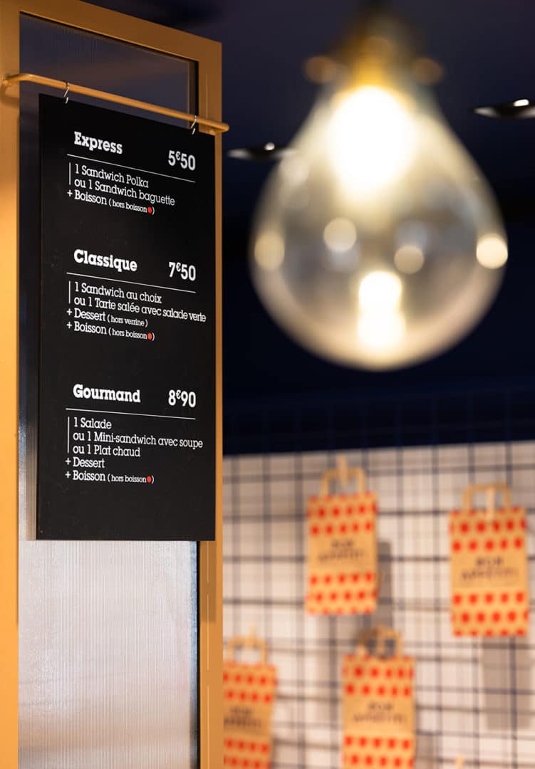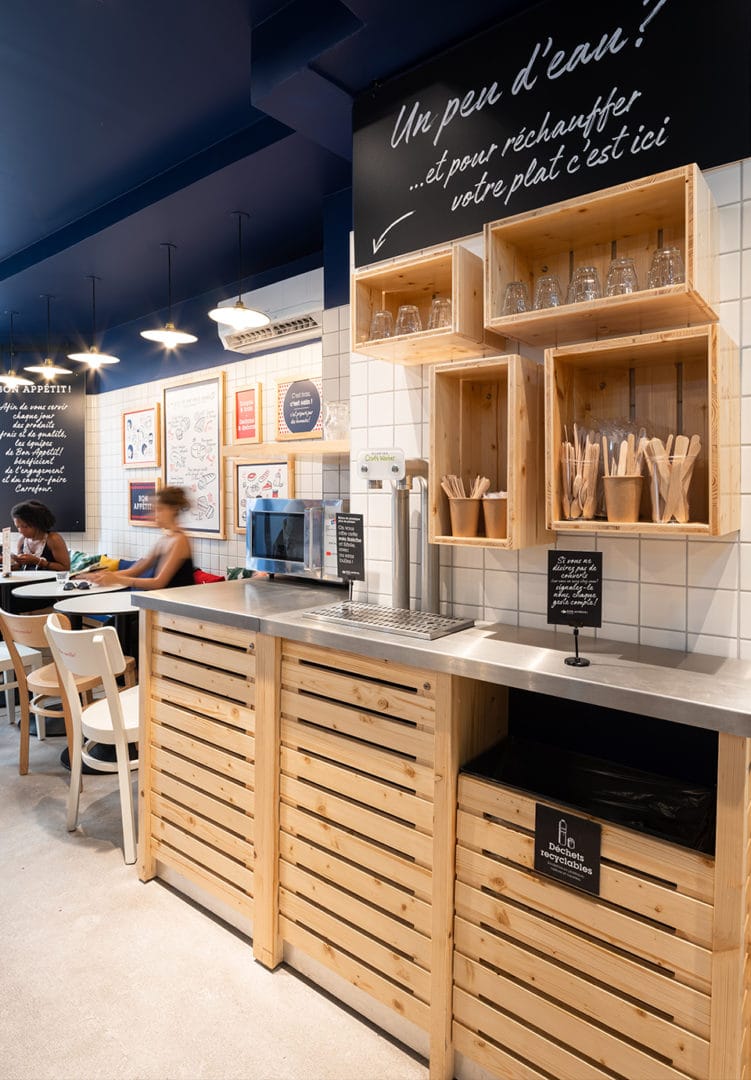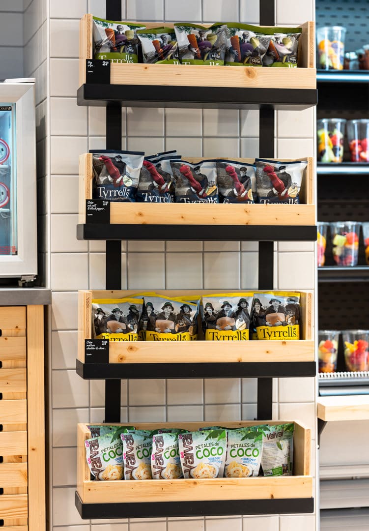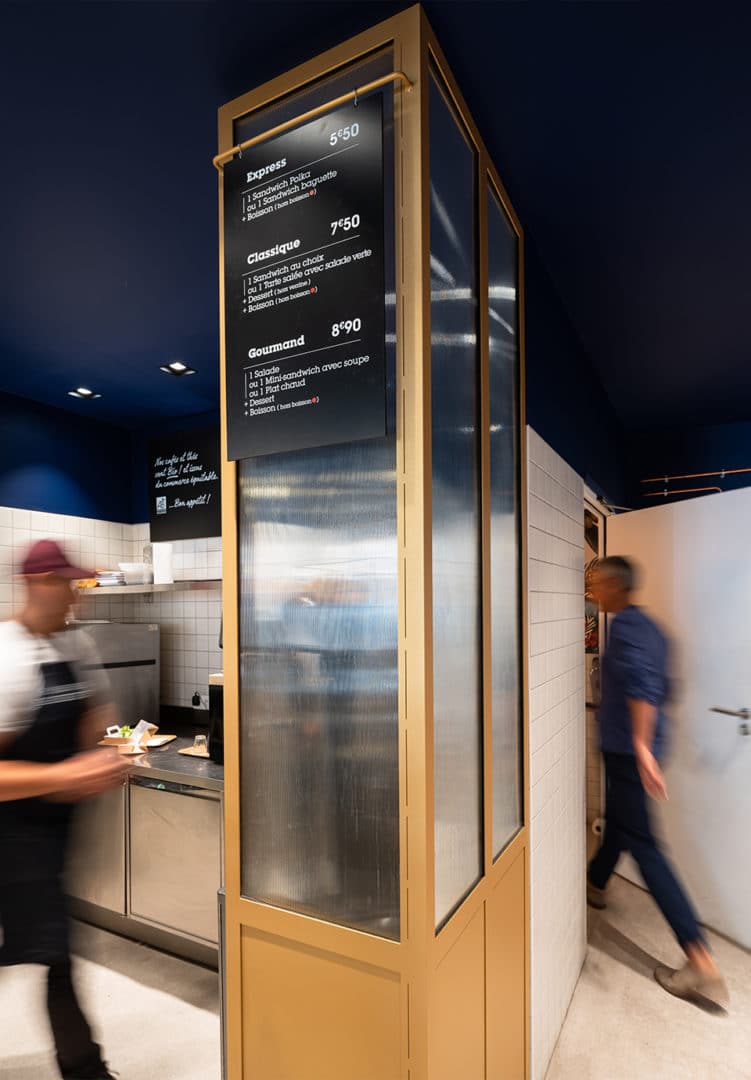 Le lieu propose une offre courte adaptée aux urbains : offre coffee shop servie au comptoir & offre fraîche de saison en libre-service.