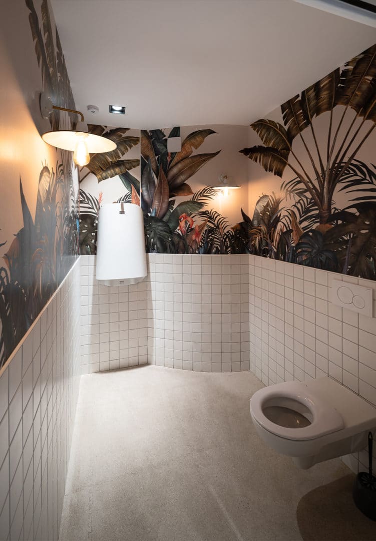 L’architecture intérieure se veut sobre & contemporaine, pour une ambiance décontractée et familière grâce aux choix de matériaux : bois brut, ardoise, carrelage 10×10 blanc, tuyauterie apparente et grâce aux détails stylistiques : ébrasements et seuil mosaïque, luminaires, papier peint, coussins…