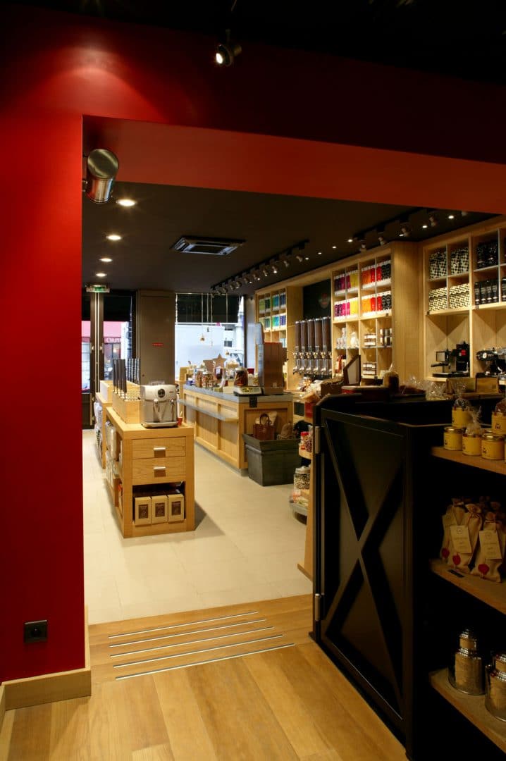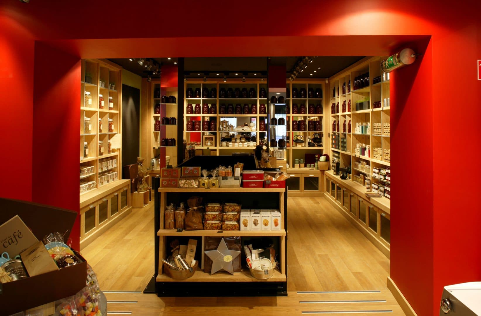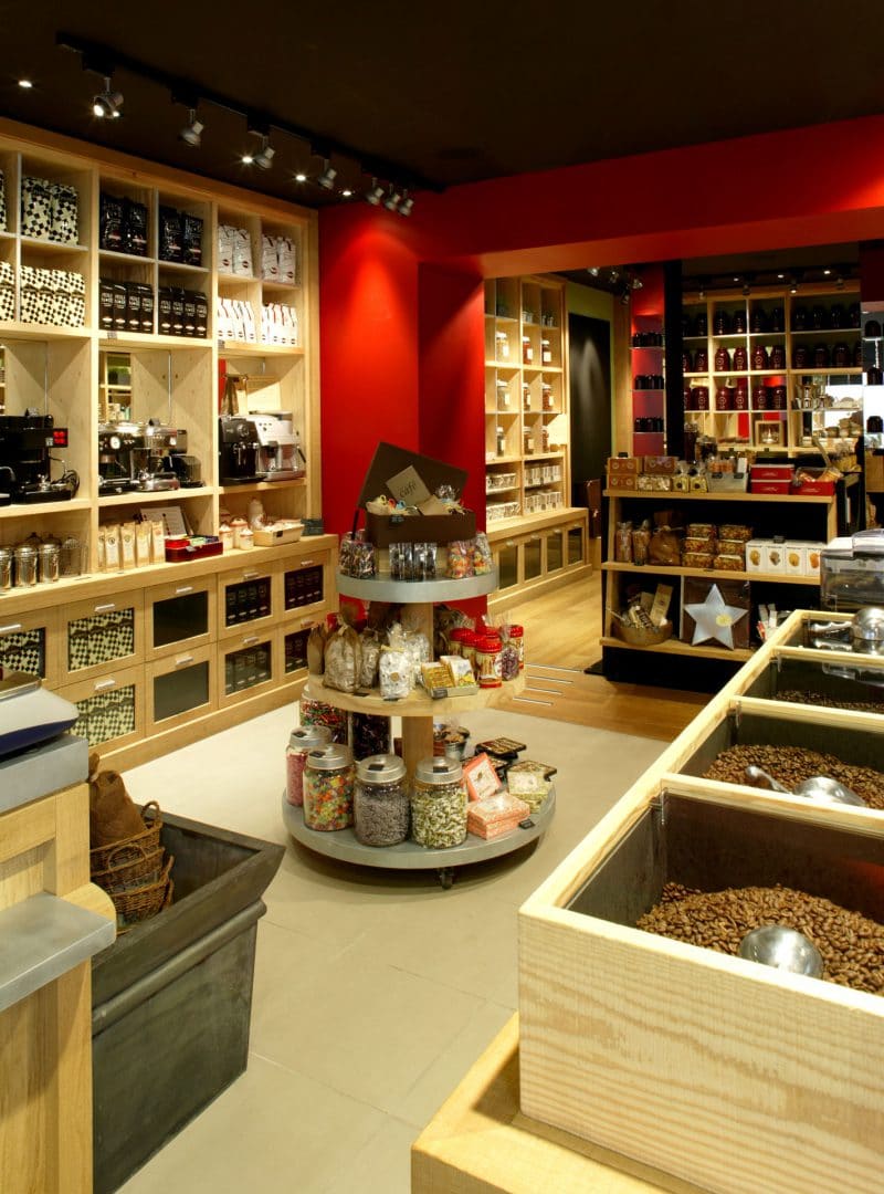 Une offre gourmande autour du café. De grands silos muraux et un grainetier invitent à la dégustation comme dans un coffee shop parisien, un mélange élégant de rouge pourpre, de zinc patiné et de noir profond accompagne les grandes étals de chêne brut qui exposent une sélection riche de gourmandises.