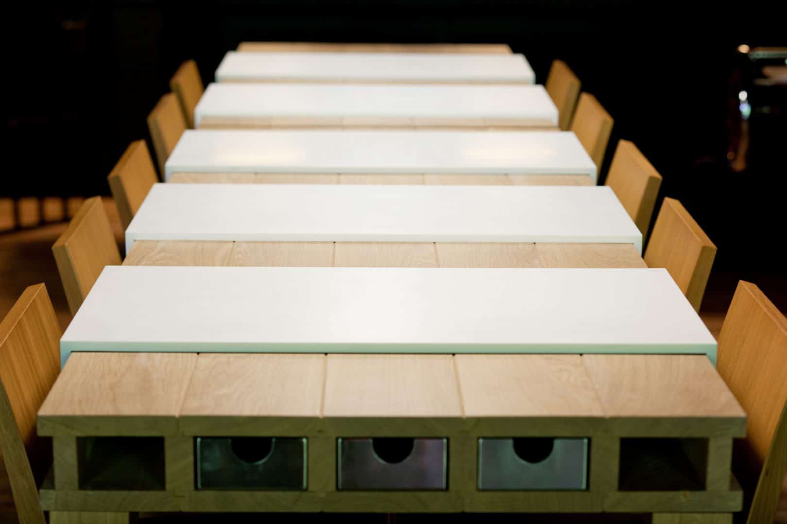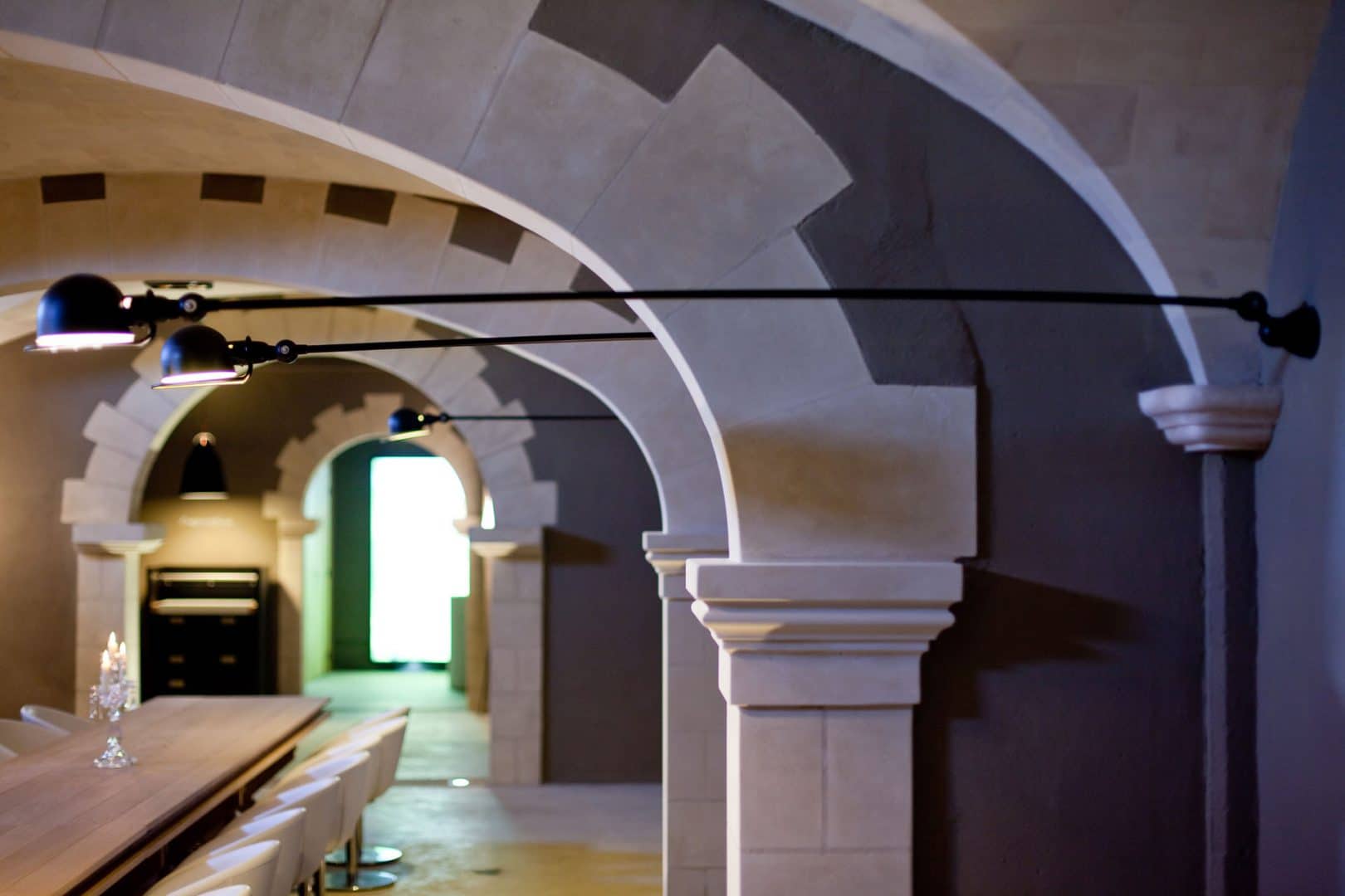 Planté sur les coteaux du Layon en pays de Loire, le domaine est repensé pour un « parcours visiteurs » immersif. Une terrasse surplombe les vignes et protège le précieux caveau réhabilité … une boutique, un espace « séminaires » et surtout une grande table de dégustation chêne brut & plateaux Corian blanc permettent d’apprécier les robes or et rubis des beaux vins de la propriété.