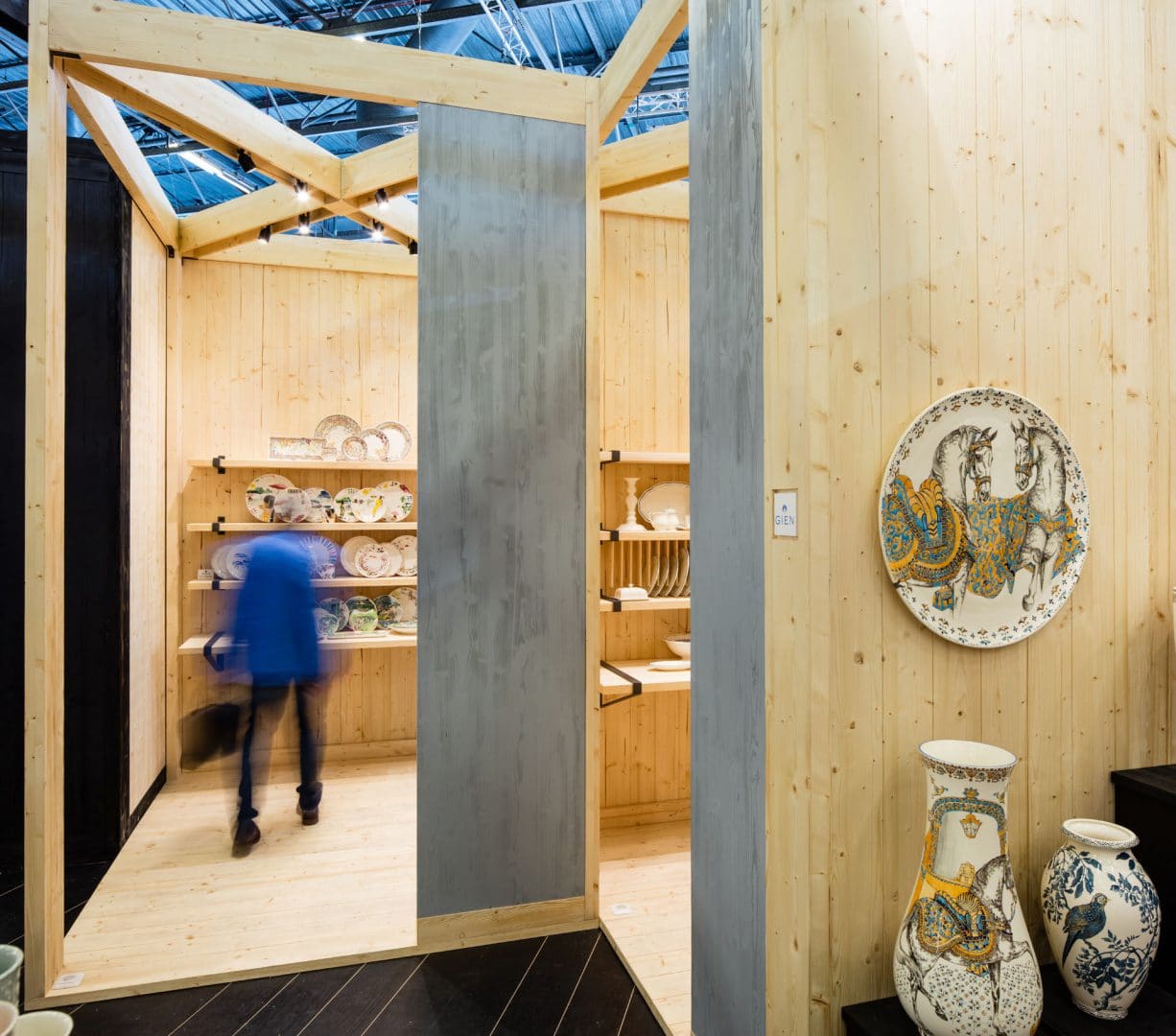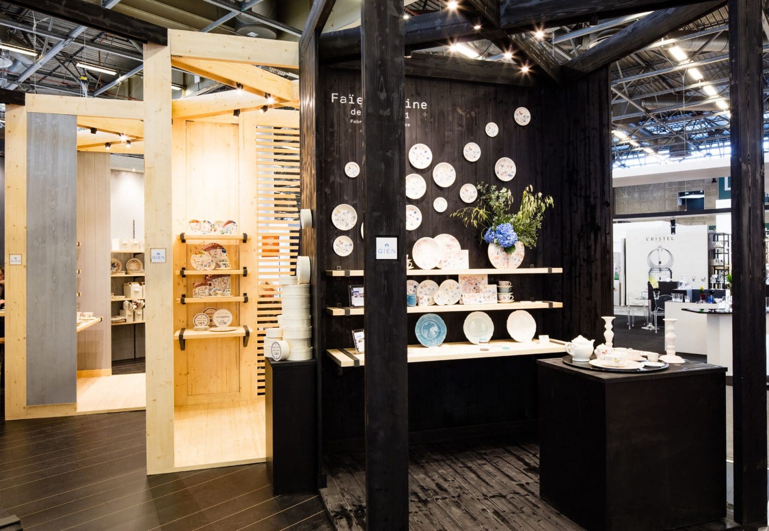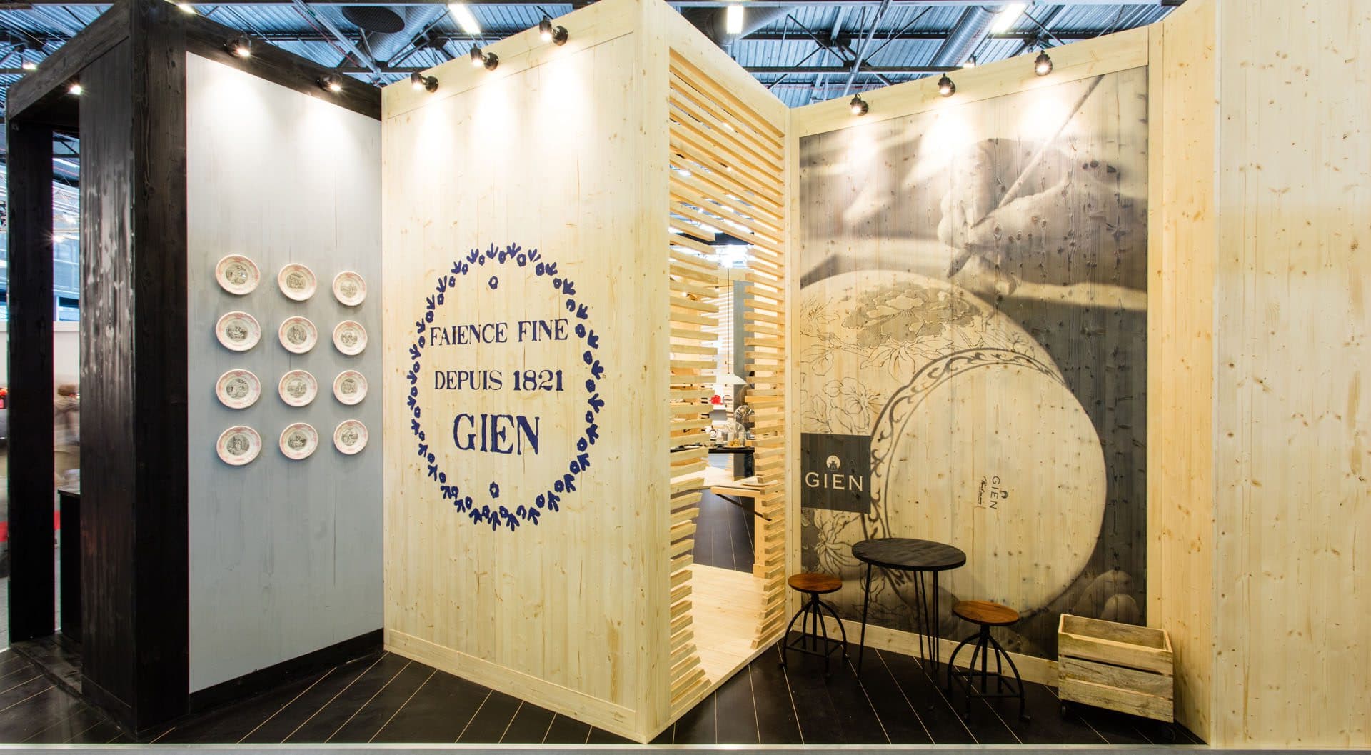 Un stand traité comme un pop up store annonce la nouvelle scénographie « Rosalie » qui sera relayée dans les boutiques … charpente brute, bois brûlé, acier vernis, couleur sable gris, typos au pochoir et faïence extra blanche sont directement inspirés de la célèbre Manufacture de Gien … à visiter ! *1er prix du salon Maison & Objet 2016.