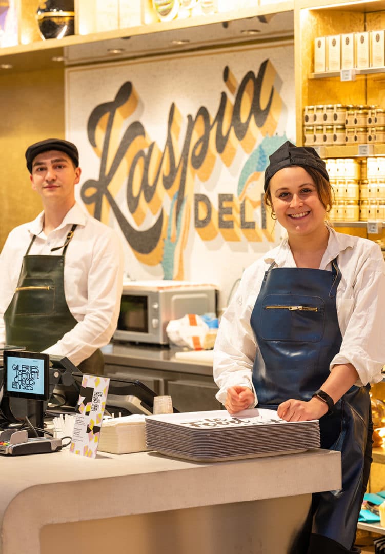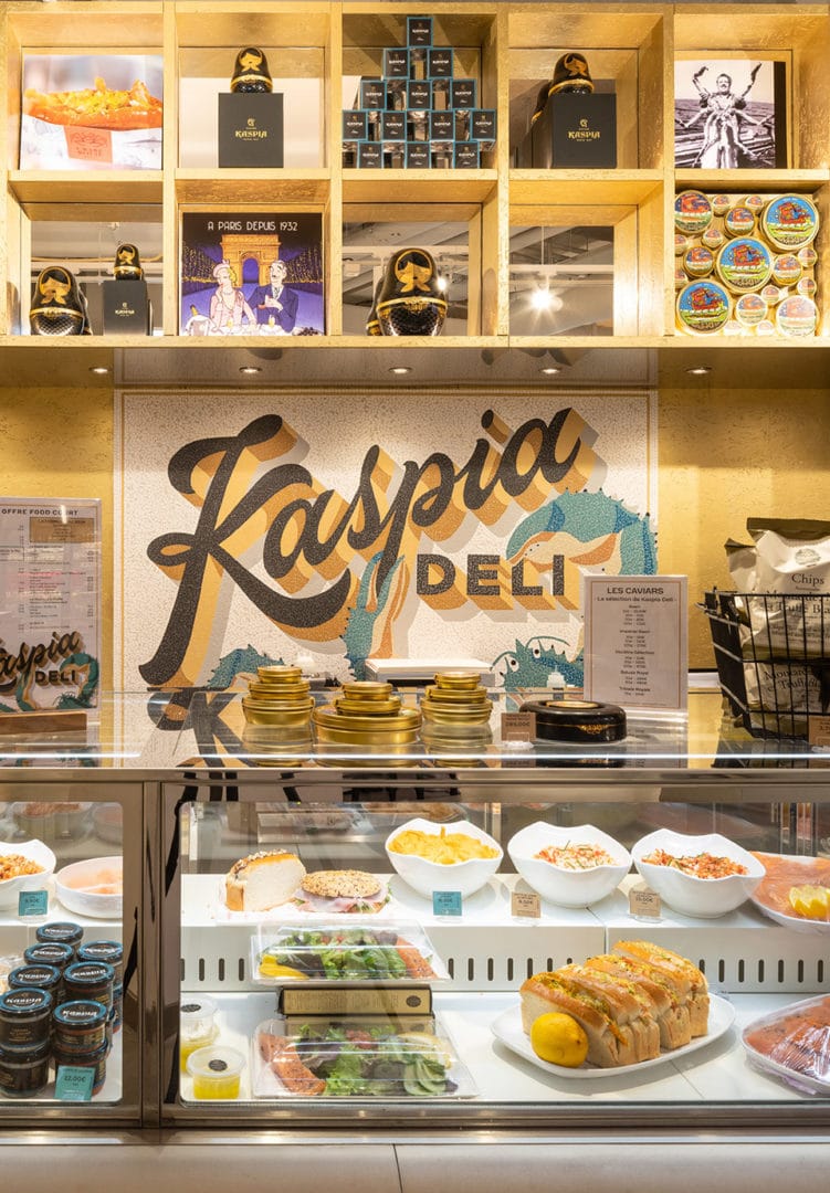 Les meilleurs extraits gastronomiques de chez Kaspia, exposés dans le Food Court des Galeries Lafayette Champs Élysées pour un « prêt à déguster » sur des grandes tables laiton signées l’agence BIG.