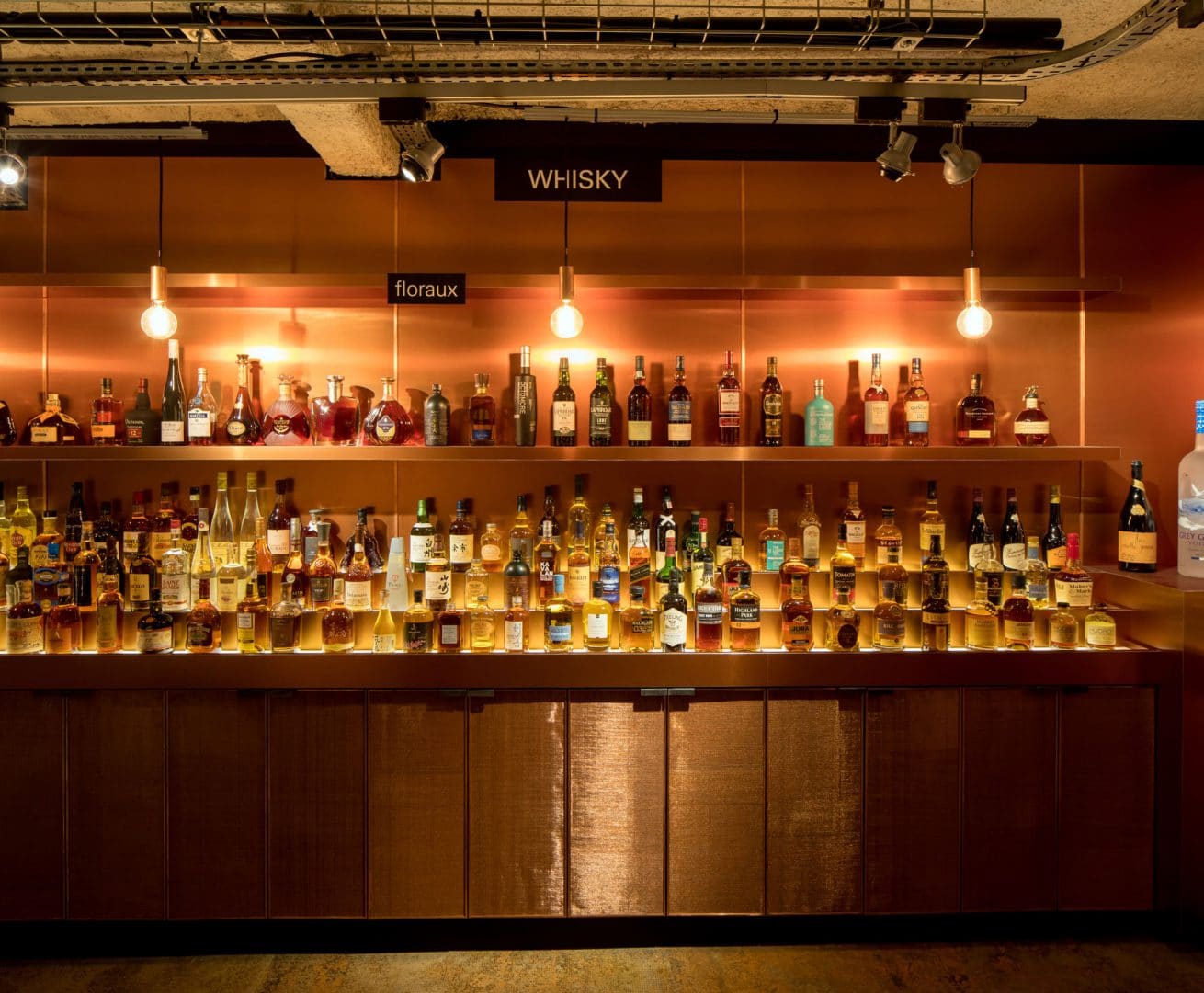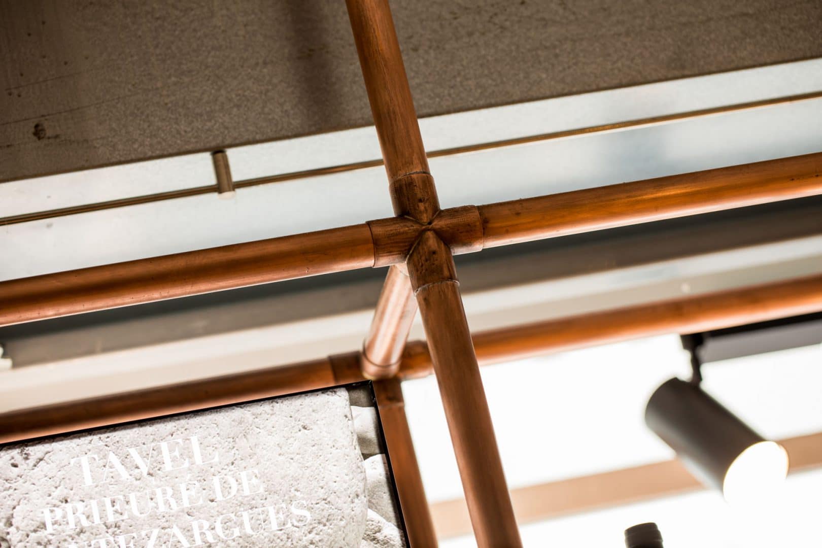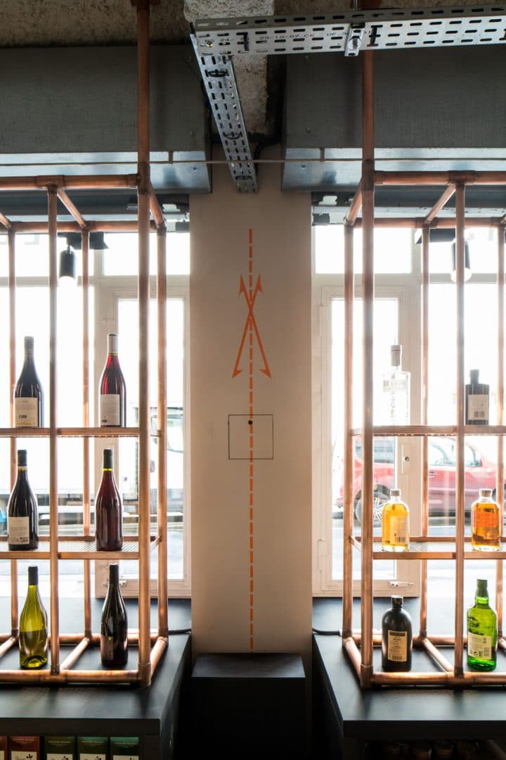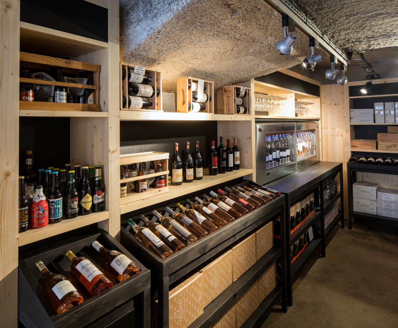 Un garage des années 50 transformé en espace de vente de vins d’exception. Un décor spontané, traité « underground », un sol brut, des piliers béton et graphite, un plafond qui assume les réseaux aériens et embarque une lumière scénique, un mobilier ergonomique. Dernière actualité, la création d’un bar à alcools dans un écrin cuivré.