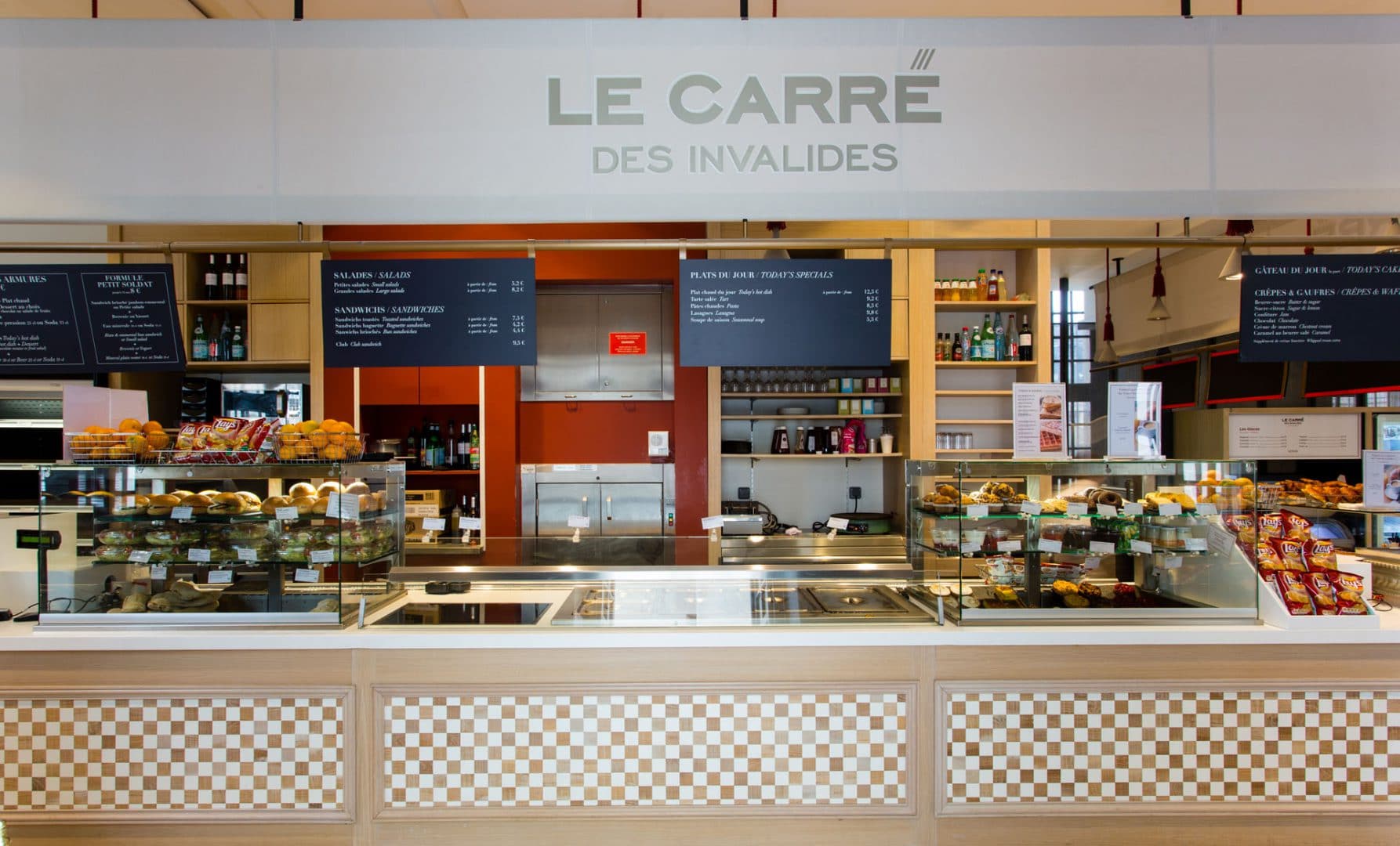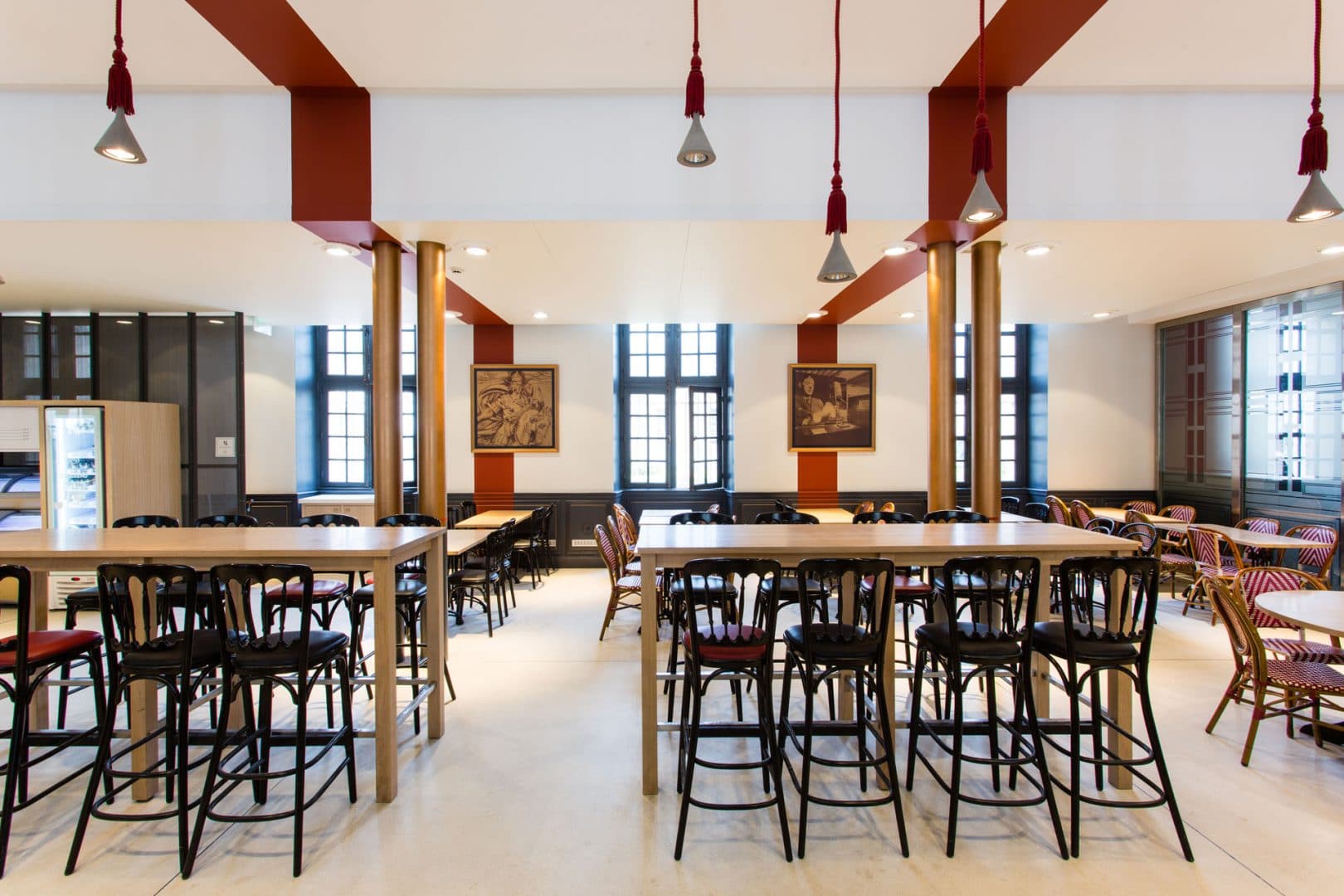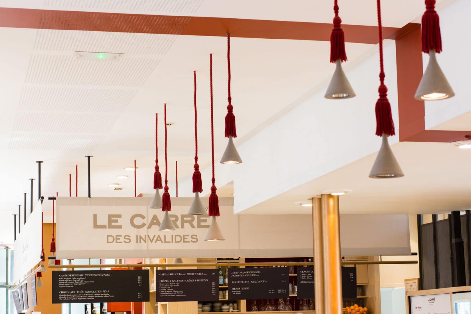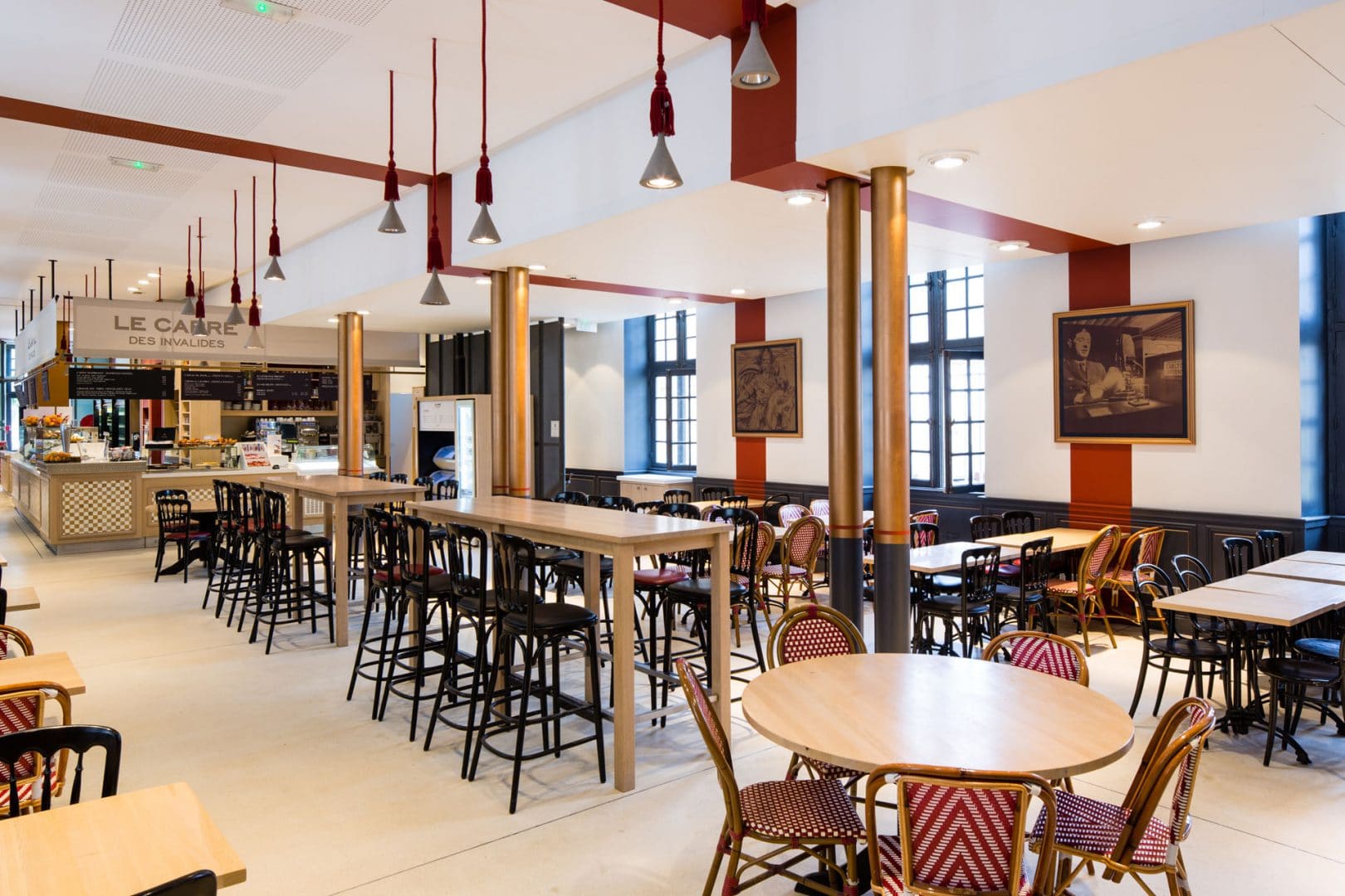 Un vrai lieu de vie qui prend tout son sens au sein des invalides. Des codes décoratifs militaires détournés pour habiller le lieu en parade gourmande … menu kakémono façon étendard, damier marbre blanc et bois en habillage, passementeries suspendues sur les lustres, rouge académique en animation ruban sur les murs.